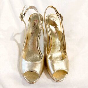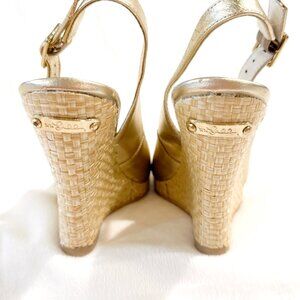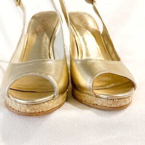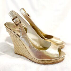 Lilly Pulitzer Kristin Gold Metallic Leather Sling Back Peep Toe Wedge Heels 7