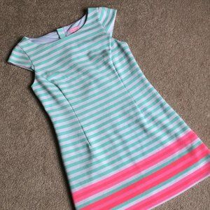 Lilly Pulitzer Lana mint green cap sleeved dress. Size M. This beautiful dress, style number 20757, has a bateau style neckline, cap sleeves, zip at the back with beautiful pineapple zip pull. The dress is striped in white and mint green, with bright pink stripes at the hem. Fully lined. Comfortable, 67% polyester, 32% cotton, 1% spandex. Very good condition. From smoke/pet-free home. Please feel free to ask any questions.