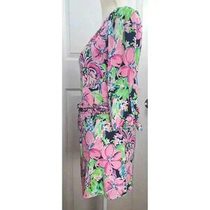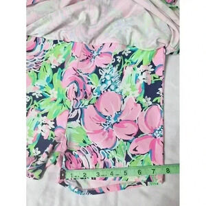 This Lilly Pulitzer Lana romper/skort in size XXS is a beautiful addition to any wardrobe. The off-the-shoulder neckline and 3/4 sleeves add a touch of elegance, while the floral pattern, bow accents, and overall dress style give it a fun and playful vibe. The pullover closure and lightweight, stretchy material make it easy to wear and comfortable for all-day wear. Perfect for any occasion, whether it's a casual day out or a party/cocktail event, this dress is sure to turn heads.