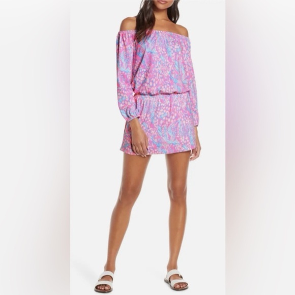 Lilly Pulitzer loved the Lana Romper so much that we made it into a SKORT. Pair with wedges for a dressier look or go casual with flats. . • Off-The-Shoulder Knit Romper With Shorts Underneath. • 3" Inseam. • Rayon Spandex Jersey (96% Rayon, 4% Spandex). • Hand wash cold. Separately. • Imported. Excellent pre-owned condition! Very stretchy -approximate measurements when laid flat (not stretched) pit to pit 19 inches length 35 inches.