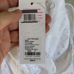 Featuring delicate cotton eyelet fabric in a tropical leaf pattern, this dress is both airy and elegant. Design details include: Tie-front bust (lightly padded) with subtle ruching for flattering shape Flutter/off-shoulder straps that can be worn on or off the shoulder Smocked back panel for flexible, comfortable fit Tall ruffle hem that adds romantic flair and movement Side seam pockets Midi length, perfect for both daytime brunch and evening soirées. Fully lined. New with tags. Size 8 Measurements: Bust 17-18" unstretched (smocking along back will accommodate extra inches) Seam below bust: 16.5" (sewn, not elastic) Length from shoulder to hem approx 50-51" Lilly Pulitzer, Eyelet, Midi Dress, Smocked, Flutter Sleeves, Tie-Front, Romantic, Cottagecore, Summer Dress, Resort, White Dress, Boho, Elegant, Garden Party, Lightweight Cotton