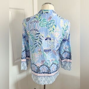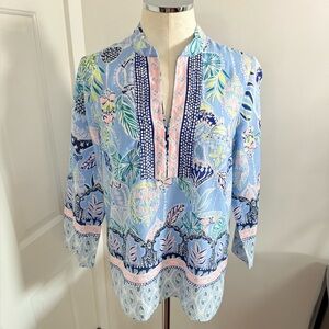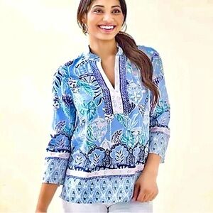 This lovely tunic top by Lilly Pulitzer features a vibrant blue and white graphic print (called lanterns), complemented by a mandarin collar and 3/4 sleeves. Its lightweight flowing fabric and intricate design make it perfect for casual outings or resort wear.