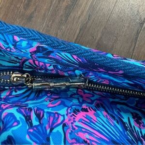 The Lilly Pulitzer tote bag showcases a vibrant paisley print in striking blue and pink hues, making it a standout accessory. Crafted from durable fabric, it features sturdy turquoise handles and an adjustable shoulder strap for versatile carrying. This tote is perfect for everyday use, offering ample space and a structured shape to maintain its form.
