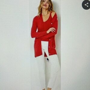 This vibrant red is called Amaryllis red with crystal buttons. The knitted set includes a v neck tank and a long cozy cardigan, ideal for layering. There are front patch pockets in the cardigan. New with tags and original shipping plastic bag.