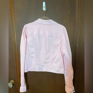 Chic light pink jean jacket with gold button closures. Features front pockets and classic collar. Please note: jacket appears a bit small for a large. Pit to pit-21”, shoulder to shoulder-14”