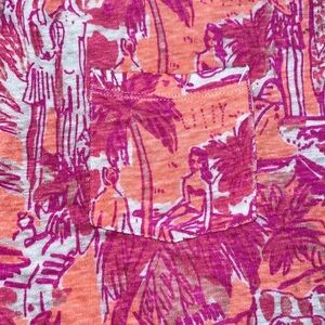 Lilly Pulitzer brand Duval top. Size small. Cheeky melon. Rule Breakers print. Pink & orange. Palm trees / sun bathing / beach party graphics. Short sleeves. Curved hem. 100% Linen. Great for Spring & Summer. Preloved. Please see all photos for condition.