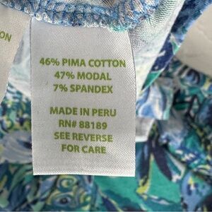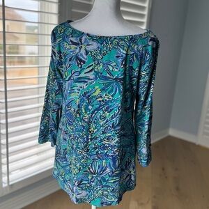 Pretty Lilly top in gently used condition. Size medium. Boat neck, long-sleeved. Pretty knotted accent on front bottom. Flowers, pineapples and leaves on the print