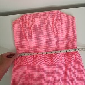 Gently used Lilly Pulitzer Lowe Fiesta Pink Pretty Gingham Strapless Dress in a size 4. Allover pink and white gingham print.