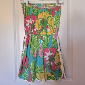 Brighten your wardrobe with this Lilly Pulitzer vibrant floral strapless romper . Perfect for sunny days, it features a colorful pattern that stands out. Side pockets and inner shorts (skort romper ).