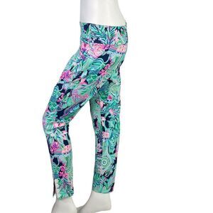 This is a pair of Lily Pulitzer 'Corso' athletic golf pant in a bright tropical print called 'Lookin Sharp', size 6. Excellent like new condition. These pants feature front slit pockets and crochet embellished slits at the ankle. Style no. 001004. All photos displayed are of the actual item. Measurements;
