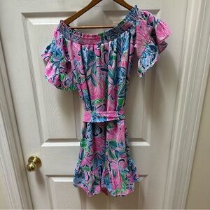 Lilly Pulitzer Maddlyn dress Pink Blue wide neck flare tie waist XXS