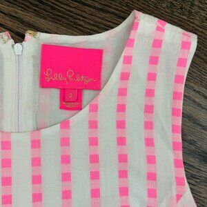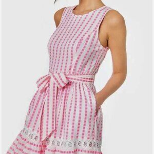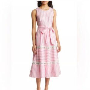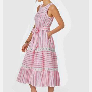 Used excellent condition! Special occasions call for a truly special look, with this Maybella Tiered Midi Dress. Gingham stripe jacquard and insert Lilly lace trim combine to create this spectacularly detailed style, which features a bra-friendly bodice, tiered skirt, and fit and flare silhouette defined by a sash at the waist.