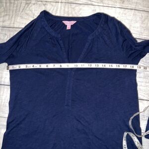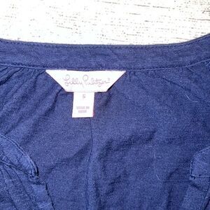 Good, preloved condition. Lilly Pulitzer Meg stop. Navy. Notch neckline and shirring. Logo embroidery at the hem. Long Sleeve Tunic With Notch Neckline And Shirring. Palm Beach Slub (100% Cotton).