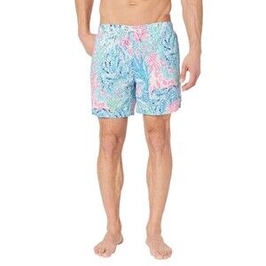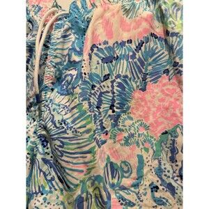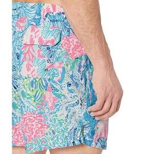 The Lilly Pulitzer Men's Capri Swim Trunks Shorts in size LARGE are a vibrant addition to any beach wardrobe. Featuring a colorful floral pattern in a multicolor design, these swim trunks are lined with mesh material for added comfort and durability. With the signature Lilly character and beach theme, these shorts are perfect for any man looking for stylish swimwear that combines functionality and fashion.