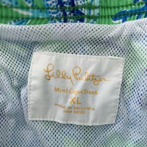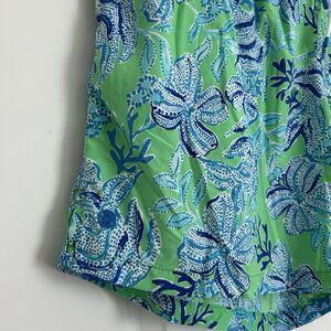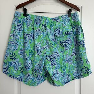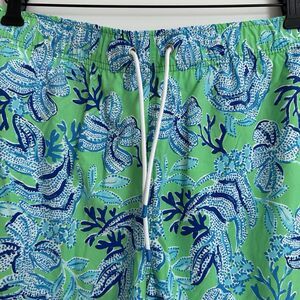 Lilly Pulitzer Mens Capri Trunks Swim Blue Green Pattern XL Front Tie Tropical 6 Inseam.