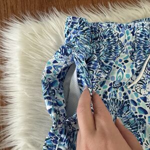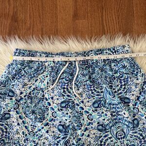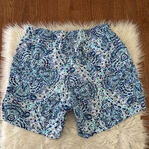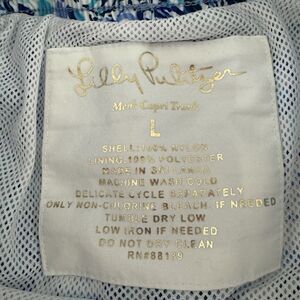 Lilly Pulitzer Mens Large Capri Swim Trunks Turquoise Oasis Lined 6 Beach Pool. Newer style. Elastic waistband with a drawstring that can be worn on the inside or outside. Mesh lining. Pockets. Retails for $98. See pics for measurements. There is a tiny mark as shown in the last photo but this is very hard to see and not noticeable when wearing. From a smoke free/pet free home