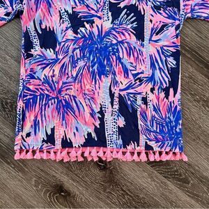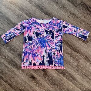 Gorgeous, vibrant blue and pink coloring. Tassel details around the hem. 3/4 sleeve. Pima cotton, modal, spandex