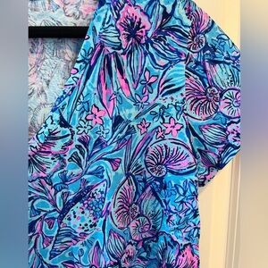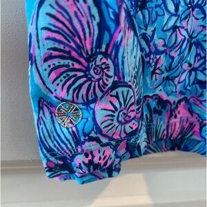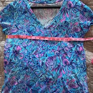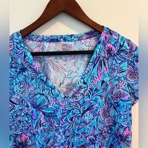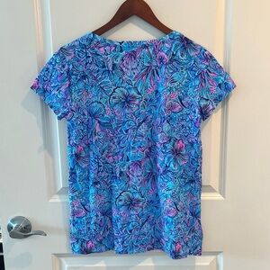 This Lilly Pulitzer Meredith V-neck T-Shirt, in the color Breakwater Blue and pattern Shells n Bells, is brand new with the tag attached. The product description is: