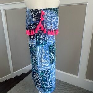 Classic Lily strapless dress! Features blue patterns with pink tassels. Perfect for summer.