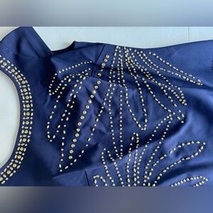 Chic midi dress in deep blue. Features gold stud patterns. Ideal for special occasions.