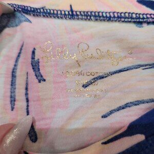 This eye-catching Lilly Pulitzer dress features a vibrant flamingo print set against a rich blue background. The buttoned sleeves add a touch of elegance and versatility, making it appropriate for both casual and semi-formal settings. The lightweight fabric ensures comfort, while the playful pattern brings a dash of whimsy to your wardrobe.