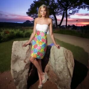 Add a pop of color to your wardrobe with this Lilly Pulitzer Patterson dress in the playful Minnie Zinny print. From the 2010 collection, this strapless mini dress features a bandeau top with light padding and boned sides for structure, a sweetheart neckline, and an empire waist that flows into a vibrant floral skirt. Fully lined and made from 100% cotton, it offers both comfort and style. Perfect for summer vacations, beach outings, or casual daytime events, this dress embodies timeless Lilly Pulitzer charm.