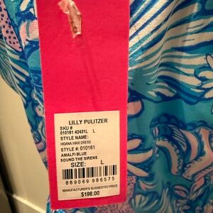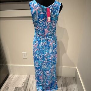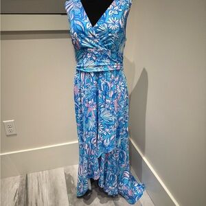 Stylish wrap dress with a vibrant floral pattern. Features shades of blue and pink.