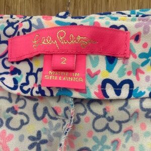 Adorable Lilly Pulitzer Casia stretch shorts in size 2. Shorts have side zipper with hook and eye closure, belt loops and ties at the waist. Shorts have a 15" across the waist, 15"length. Is 97% polyester and 3% spandex. Excellent condition. No stains or tears.