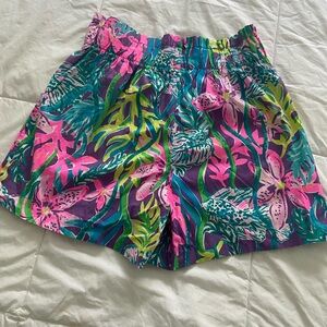 Chic shorts with a vibrant floral design. Features pink, green, and purple tones. Front pockets. Excellent condition.