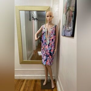 Chic dress with vibrant patterns. Features intricate detailing. Ideal for standout style.