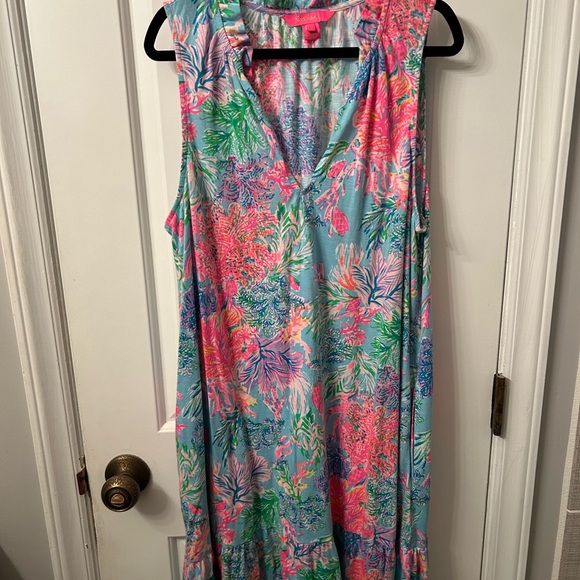 Lilly Pulitzer dress with ruffle details and side pockets. Features pink, blue, and green floral patterns. Size large