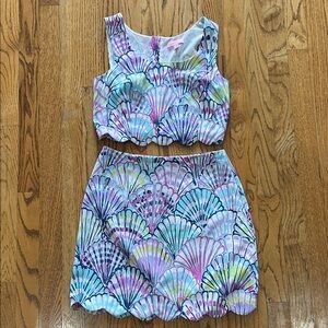 Oh Shello Lilly Pulitzer skirt and crop top set. Both in size 2. Vibrant shell print top and skirt set. Features scalloped edges. Beautiful and so fun!! I wore it once for a girls trip! A bit snug on me in really a 4 but wanted it bad enough to not eat too much ;) yours for a great deal!