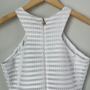 NWT the Crochet Stripe Knit Megyn dress has fabulous style with a fitted top and cute skater skirt. It's all in the details with striped crochet and a cut out v-neck in the always classic resort white. It has a zipper back closure with an adorable decorative gold starfish pull!
