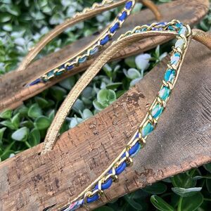 • The Naples sandals is a metallic cork flip flop with chain and woven fabric details on the straps. This sandal can be dressed up or down