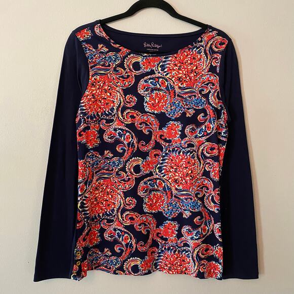 Lilly Pulitzer Women's size Medium Navy Blue Paisley Colorful Long Sleeve Shirt. Lilly Pulitzer brand women's long sleeve shirt in a size medium. Navy blue colorway with blue and red paisley designs. Boat neck neckline. Small pin hole at the shoulder as pointed out. Measurements as pictured. In great pre-owned condition, see photos for more details. Always feel free to ask any questions you may have! Reasonable offers accepted.