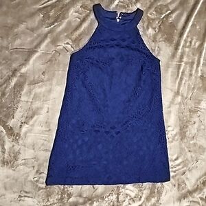 Design: Halter neckline ✦ sleeveless ✦ fitted shift silhouette ✦ lace overlay ✦ concealed back zipper ✦ above‑knee length