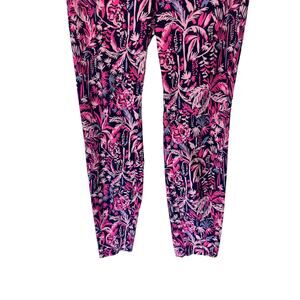 Lilly Pulitzer Navy Pink Swing of Things Kelly Skinny Ankle Pant. "Tropical pattern with pinks and blues along with hidden monkeys. Pants have a zipper & gold button front closure, faux pockets and are stretch"