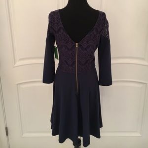 Lily Pulitzer navy, fit & flare dress with lace top and low v back. Gold exposed zippered back add a subtle statement. Gorgeous silhouette perfect for weddings and that special night out! Belt on model is not included.