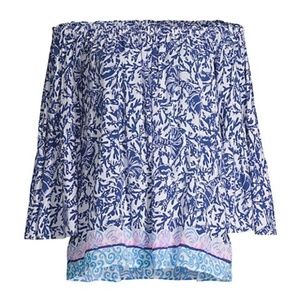 New with tags NWT Lilly Pulitzer Nevie Top, Sz XS. Originally retailed for $114. Beautiful flowing top flaunts a sultry off-the-shoulder neckline, flounced sleeves and an allover printed design.