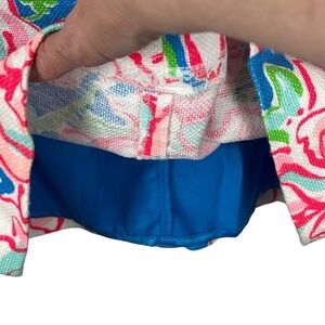 Highly sought after Lilly Pulitzer print. Colorful dress with bold floral patterns. Features pink, blue, and green hues.