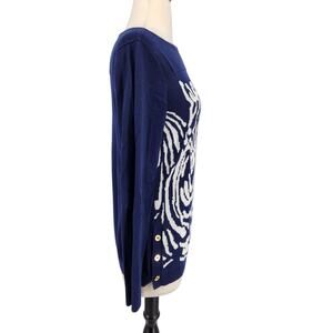 This sweater from Lilly Pulitzer features a navy blue cotton knit body with a bold white zebra graphic across the front. Designed with gold buttons along the side seam and ribbed trim, it offers playful elegance with a luxe finish.