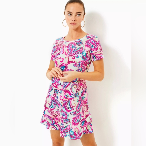 Tags: Lilly Pulitzer, t-shirt dress, casual chic, tropical print, resort wear, vacation style, beach dress, summer outfit, short sleeve, mini dress, easy fit, preppy style, colorful print, coastal style, everyday dress, lightweight, feminine, classic Lilly, travel friendly