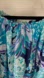 Vibrant off-shoulder dress with a tropical print. Features shades of blue, purple, and green.