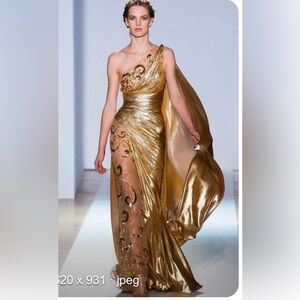 Has beautiful flowy ruffle down one side of dress attached to the one sleeve Dress is straight fit Very flattering and elegant Makes you feel like a Grecian princess