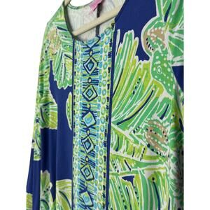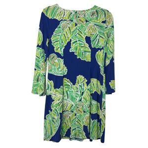 Vibrant and breezy Lilly Pulitzer dress featuring a bold tropical palm leaf print in shades of green and aqua against a rich navy background. Made from a soft stretch rayon blend for comfort and easy wear. The geometric printed panel down the front adds a signature Lilly touch of resort elegance. Perfect for sunny getaways, casual brunches, or warm-weather events.