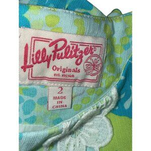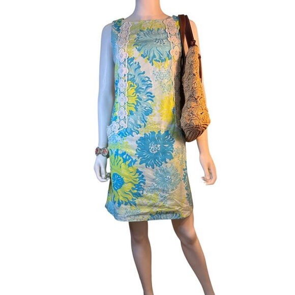 The Lilly Pulitzer Originals Shift Dress in Seeing Things Blue Green Floral Print 2 is a vintage-inspired piece perfect for a variety of occasions. This sleeveless dress features a round neck, zip closure, and embroidered accents. Made from a blend of polyester and cotton, the knee-length dress is adorned with a vibrant multicolor floral pattern, making it ideal for summer, fall, and spring wear. The shift style and lined interior ensure comfort and ease of movement, while the brand's signature Lilly Pulitzer touch adds a touch of luxury to your wardrobe. Thank You for shopping my Closet!! Measurements: 35” Long and 16” Pit to pit. Save 15% by Bundling 2 or More Items from this Closet