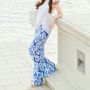Lilly Pulitzer Lolani Silk palazzo pants. Flare flowy structure perfect for resort or vacation wear. Blue swish skipped a beach allover print. Hidden side zipper.