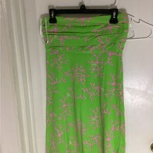 Chic strapless dress in lime green. Features a subtle coral pattern. Classic Lilly pattern and colors