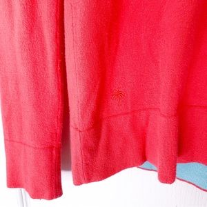 Really cute Lilly Pulitzer long sleeve knit sweater. Solid deep/bright pink color with bright blue inner trim. If you roll up the sleeves the blue would show. Large V neck. Small embroidered palm tree logo on the bottom front. 80% cotton, 17% nylon, 3% spandex. Machine wash and lay flat to dry.