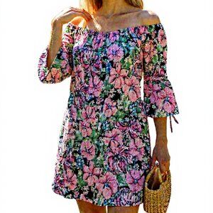 Lilly Pulitzer off the shoulder Lana skort romper. Size small. Pink Blossom Zest floral print. Off-the-shoulder neckline, skirted bottom, and smocked sleeves with ties at elbow. Bright print and jersey fabric, it's chic and comfy enough to take you from sunny-day fun to starry-night celebrations. The last photo is the same romper in a lighter print shown for fit purposes.